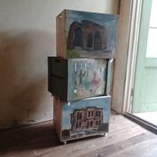 油絵デザインとボックスの組み合わせが印象的なキャスター付きボックスです。ボックスにはアンティークのような加工を施しています。