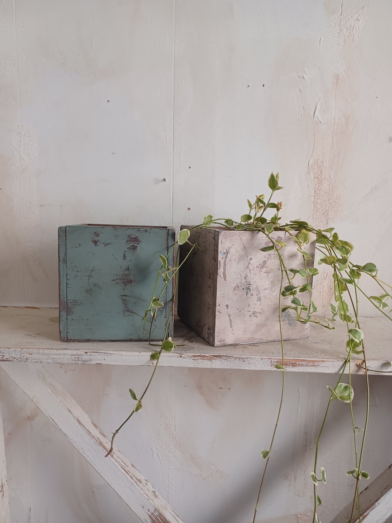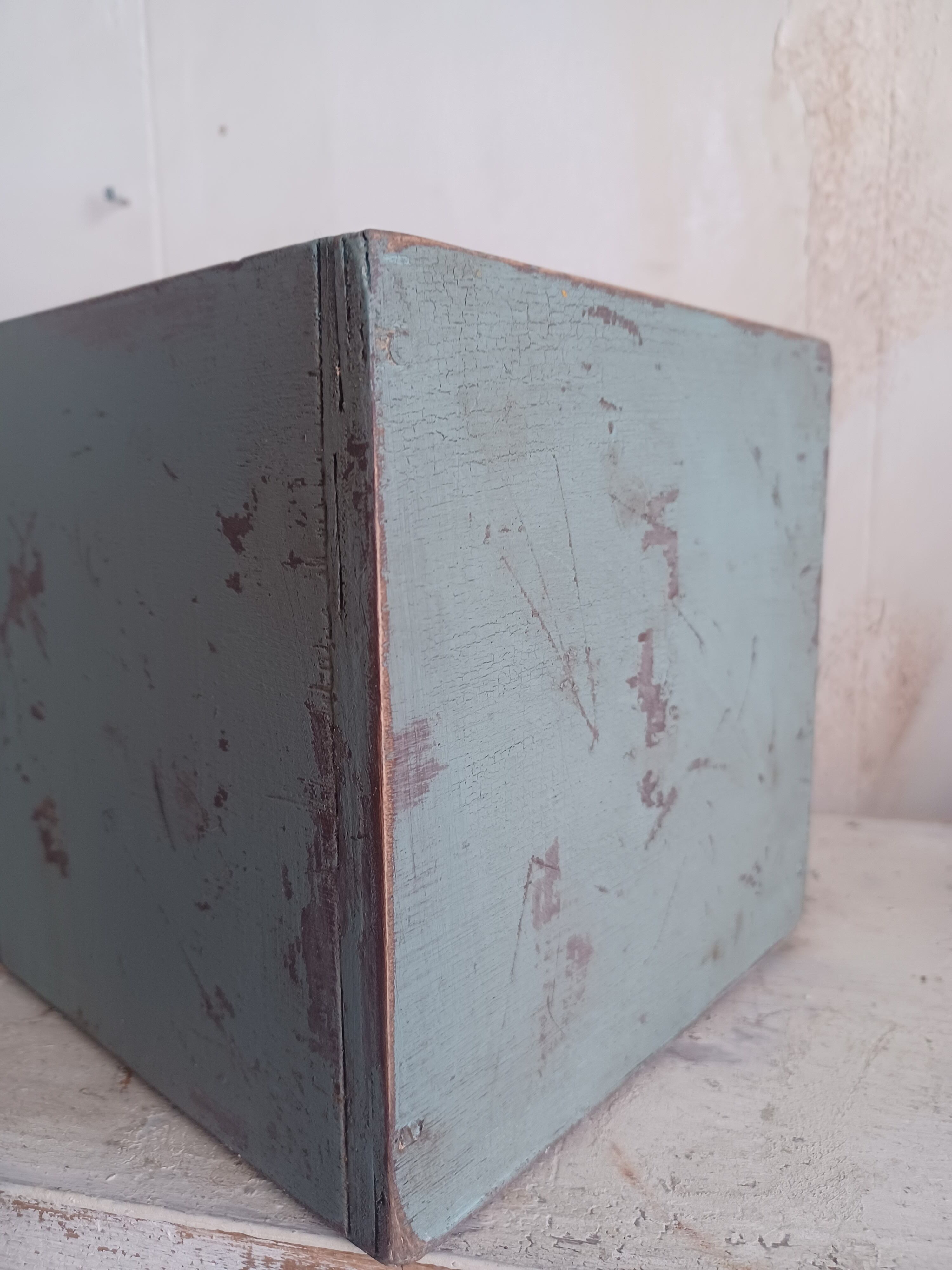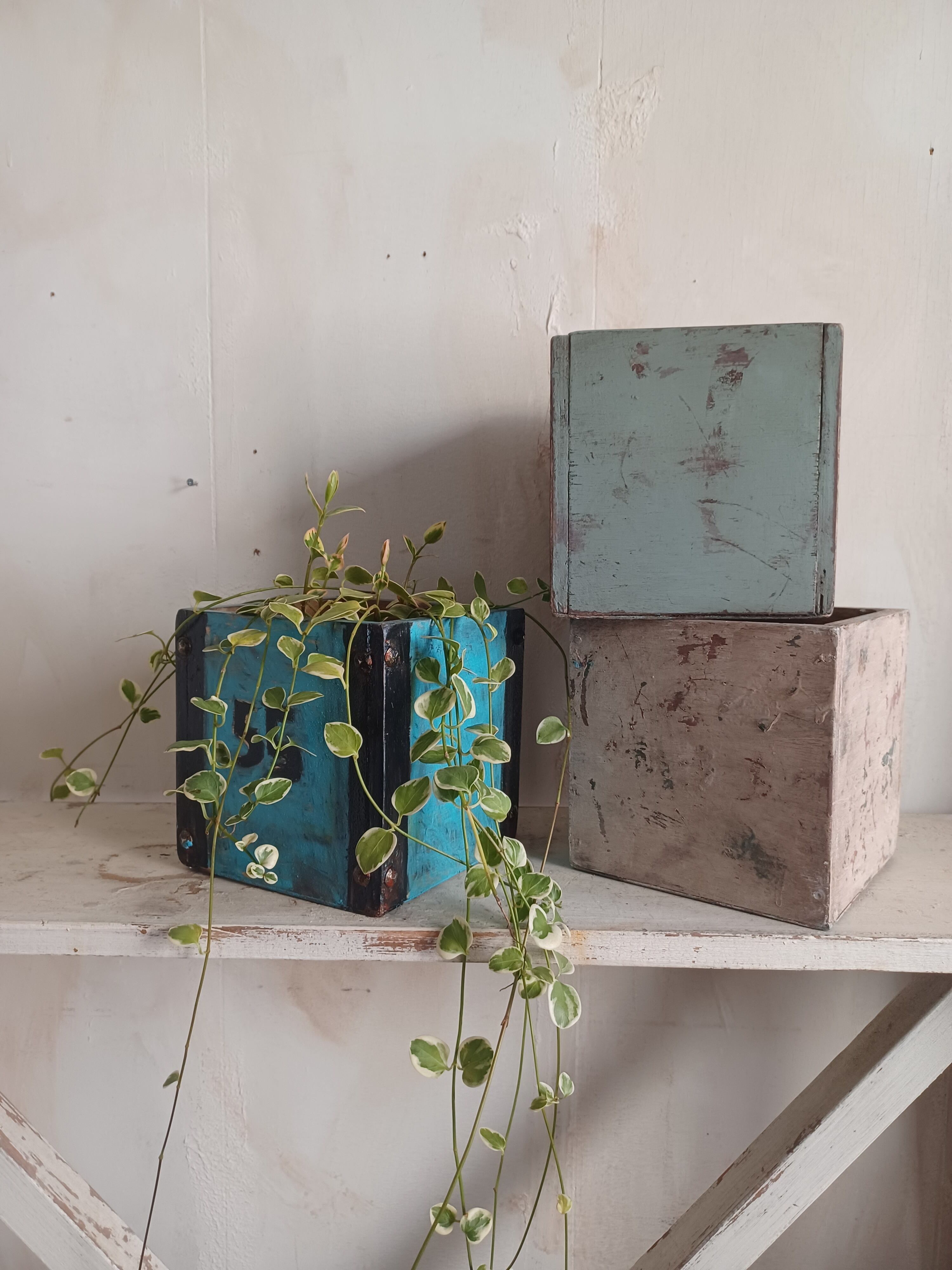 人気の水色のカラーと塗装の剥げが印象的なボックスです。植物を入れたり雑貨をディスプレイしたり小物の収納にも良いですね。